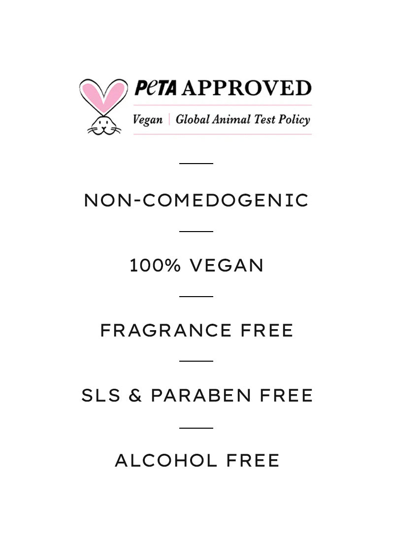 Our range is Non-comedogenic, 100% Vegan, PETA Certified, Fragrance Free, SLS & Paraben Free, Alcohol Free
