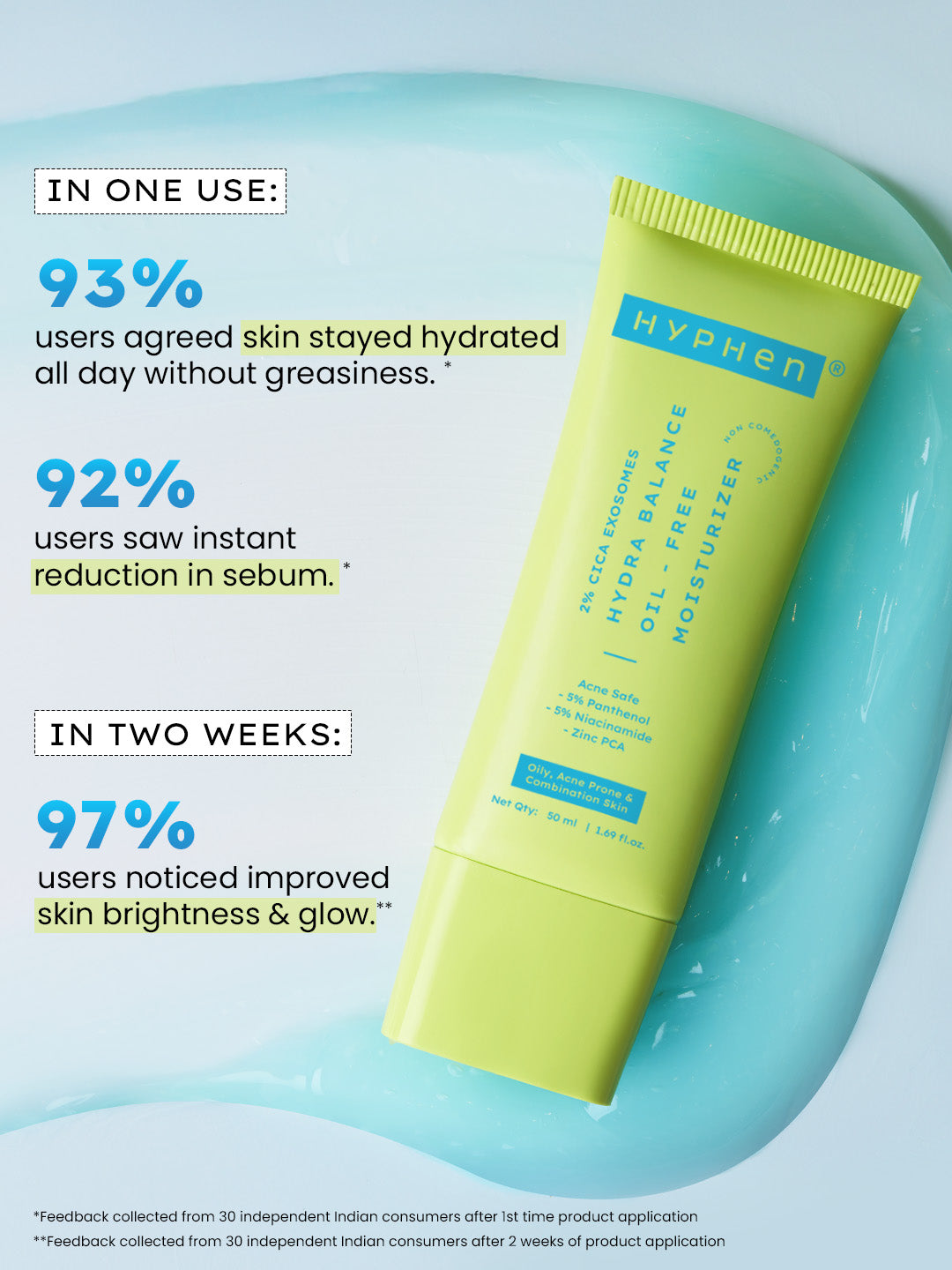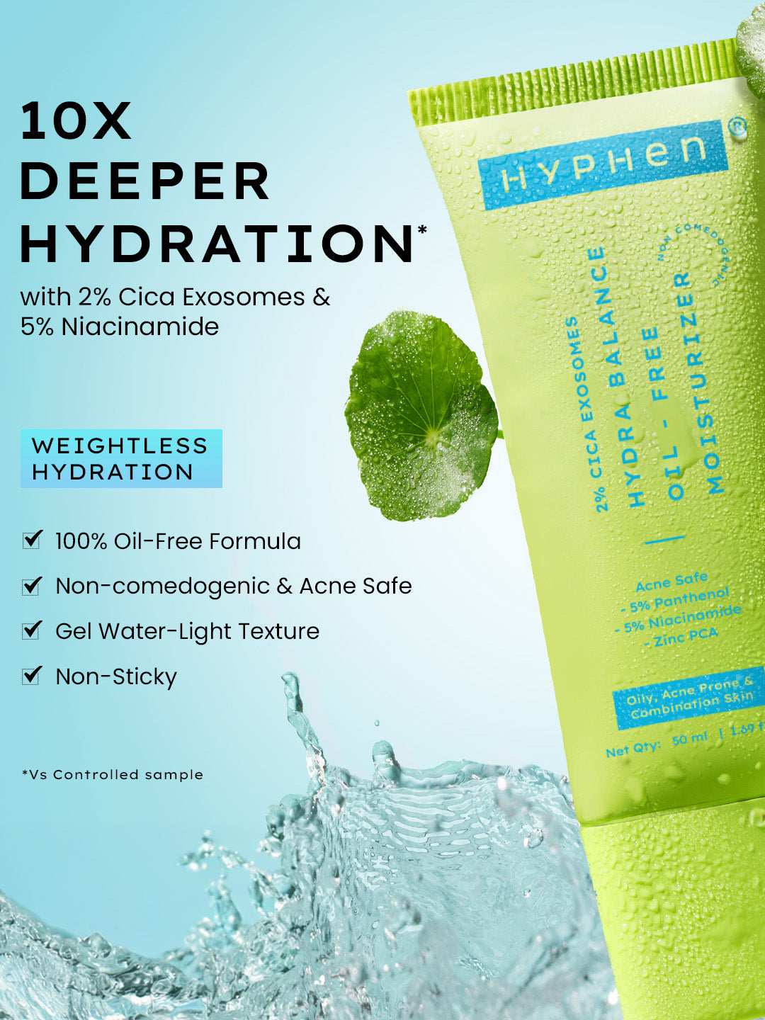 A super light gel based moisturizer that’s 100% Oil-free. Infused with 2% Cica Exosomes & 5% Niacinamide it delivers deep hydration to your skin cells for up to 100 Hrs of Hydration*. It’s non-comedogenic and suitable for Oily, Acne Prone & Combination skin. The water-light texture absorbs quickly with zero heaviness.